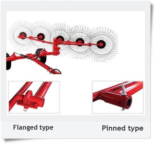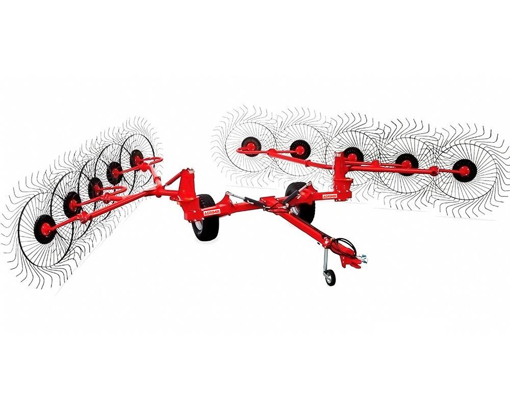 Trailed type carted rake has two single rake frames operated by independent acting cylinders, which use tractor hydraulics to raise and lower the finger wheels from transport to field position. The tyne shape and special steel used in manufacturing have been studied to give them the best flexibility.The final result is a fluffy windrow suitable to form an even and compact bale. The two rake main frames, pivot and slide on the trolley frame giving you the possibility of setting the rake working width at your convenience, maintaining the optimum inclination in respect to the crop you are raking. The wide frame of the trolley allows for maximum stability of the rake even in rough terrain.